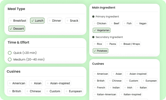 Control meal type, cooking time, cuisine, & ingredients